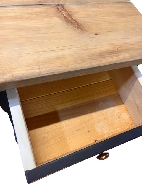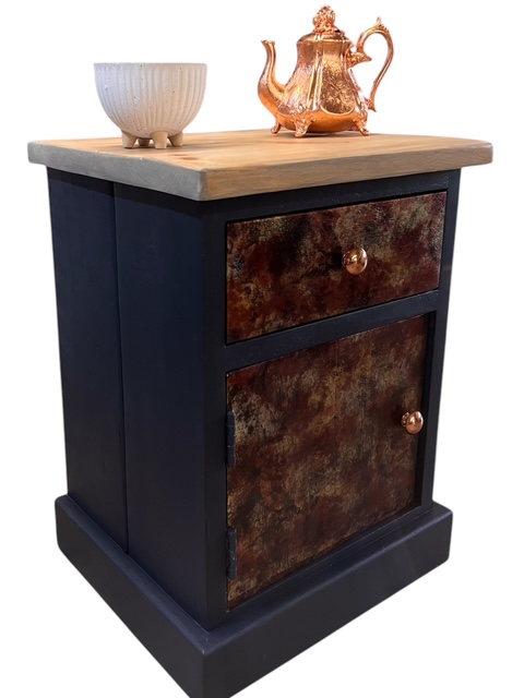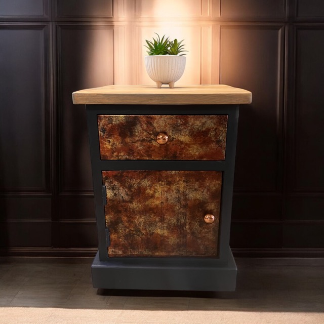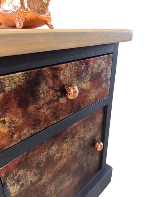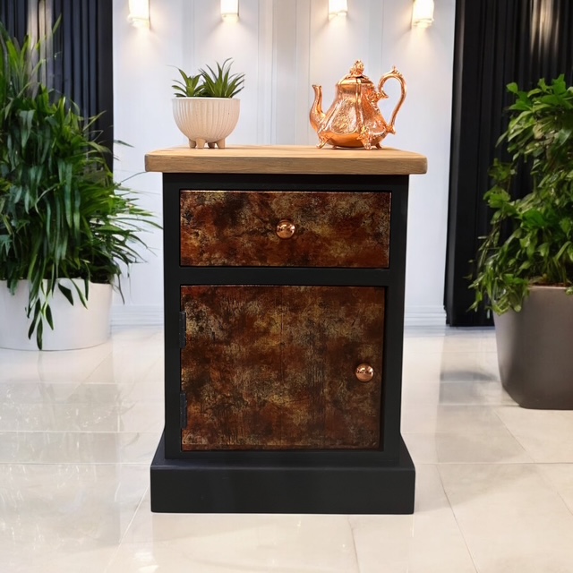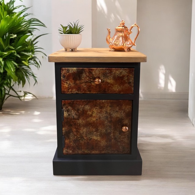 The storage cupboard and spacious drawer are fitted with high-quality, mirror finish copper styled knobs, perfectly complementing the doors and drawer fronts. These have been double-layered with a metallic material in copper tones, creating a unique finish. The top has been stripped and dark-tone waxed, resulting in a subtle shadow sheen highlighting the beautiful wood grains and knots.