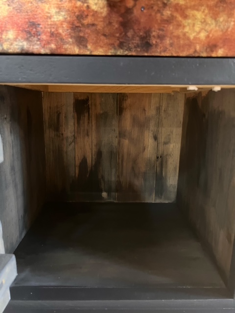 To ensure durability, the extensive prep and finishing process included two coats of primer, three coats of Fusion’s After Midnight mineral paint, and a clear wax finish. The drawer and door fronts have been treated with a crystal-clear lacquer for extra protection.