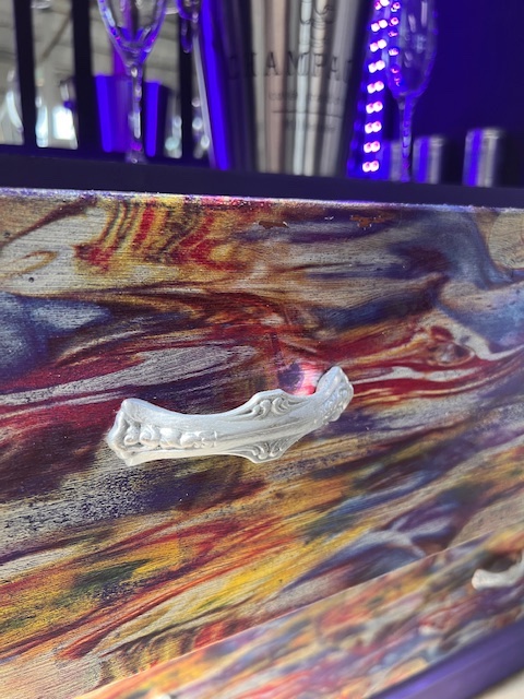 FRONT (LOWER) features 3 sizable drawers providing such useful storage – ideal for storing bottles, glasses and bar accessories. The fronts of the top and bottom drawers have been treated to a metallic decoupage design, whilst the middle drawer has been hand-painted using mineral paints fused with various tie-in tones of metallic mica powders.