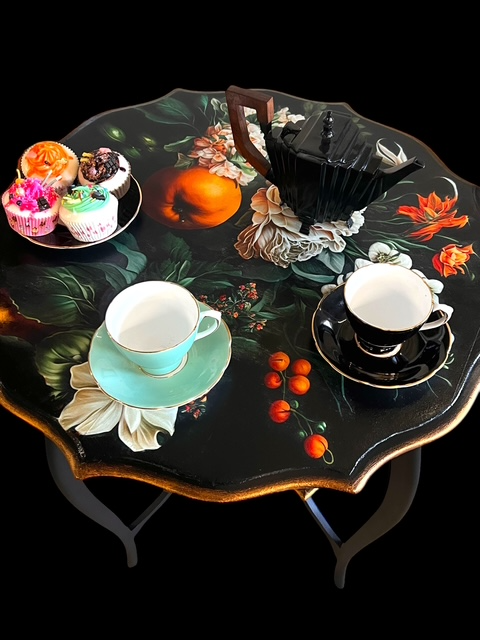 In brief: the table has undergone the most thorough programme of refinishing processes, including stripping, priming, hand painting, decoupaging, hand-painted blending and metallic copper waxing to both tier edges. For added durability, ultra tough and double clear top coats have been applied.