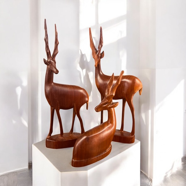 A stunning set of 3 hand-carved, vintage Deer/Antelope. So rare to find a full and matching family set, especially in such great condition. These beautiful examples are hand-carved out of teak – destined to last for generations to come. Includes both parents and their young.